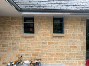 La maison était en rénovation et une isolation par l'extérieur avait été réalisée laissant un façade aux coffrages métalliques froids et un mur était en crépis. Réaliser une façade en pierres en trompe l'oeil a permis d'harmoniser et réchauffer l'ensemble de la façade tout en lui redonnant son charme initial.